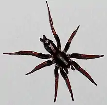 The spider species Herpyllus ecclesiasticus is commonly called the eastern parson spider, after the abdominal markings resembling an old-style cravat worn by clergy in the 18th century.[2] It is mainly found in North America east of the Rocky Mountains, i.e., Alberta, Canada east to Nova Scotia, Canada and south to Tamaulipas, Mexico and Florida, USA.[3][4] Individuals can be found throughout the year. They can be found in homes and under rocks or logs in deciduous forests.[4]