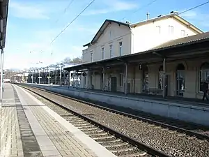 Herzogenrath station is the most important railway station in the city of Herzogenrath, Städteregion Aachen, NRW, Germany. Here, the lines to Sittard via Landgraaf and Heerlen and to Stolberg, both part of the regional Euregiobahn network, branch from the main line from Aachen to Mönchengladbach. The station is in the area of the Aachen transport association (Aachener Verkehrsverbund, AVV) and linked to an adjacent bus station and a park-and-ride parking deck. For the RE 18 trains to Heerlen, this is the only stop in Germany.