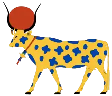 In Egyptian mythology, Hathor is one of the main cattle deities as she is the mother of Horus and Ra and closely associated with the role of royalty and kingship.[2] Hesat is one of Hathor's manifestations, usually portrayed as a white cow representing purity and the milk that she produces to give life to humanity.[2] Other feminine bovine deities include Sekhat-Hor, Weryt, and Shedyt.[3] Their masculine counterparts include Apis, Mnevis, Sema-wer, Ageb-wer.[3]