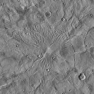 Tyrrhenus Mons (Tyrrhena Patera) is an eroded, low-lying volcano in the western part of Hesperia Planum. It is one of the oldest large central-vent volcanoes on the planet[26] and a member of a class of volcanoes called highland paterae, which erupted mainly in the Late Noachian and Early Hesperian.[27] Tyrrhenus Mons stands only 1.5 km above the surrounding plains. At its center lies a 40 km diameter depression, or caldera, from which radiate numerous flat-floored valleys and ridges that suggest the volcano has been highly eroded. The low relief of Tyrrhenus Mons combined with its degraded state indicate the volcano consists largely of friable and easily eroded material such as volcanic ash. The ash was likely derived from the interaction of magma with groundwater or ice.[28]