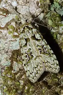 Male. — 26 mm. Head and thorax whitish-greenish, shoulders olive-greenish. Palpi whitish-greenish, apex of basal joint and a band before middle of second fuscous. Antennae greyish-ochreous, basal joint dilated, whitish-greenish. Abdomen pale whitish-ochreous. Legs dark fuscous, apex of joints whitish, posterior pair pale whitish-ochreous. Forewings elongate, posteriorly slightly dilated, costa gently arched, apex obtuse, hindmargin straight, oblique ; pale greenish, irregularly irrorated with white, especially towards hindmargin ; about eight small black spots on costa, from which proceed obscure olive-green inwardly oblique strigulae ; three inwardly oblique pairs of large tufts in disc, olive-green anteriorly, white posteriorly, margined above and below by small black spots, first near base, second at 13, third at 23 ; a short black streak on fold between second pair, crossed by a cloudy black mark margining them anteriorly ; a slender white sinuate longitudinal line in disc between second and third pairs, unevenly black-margined, crossed by three or four irregular fine white strigae ; a sub-terminal series of small fine irregular black marks, angulated in middle ; hindmargin irregularly dotted with black scales : cilia whitish, towards base sprinkled with greenish. Hindwings and cilia whitish.[3]
