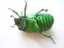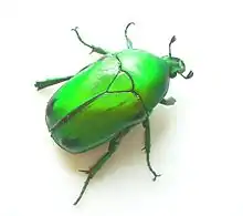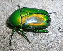 Heterorrhina elegans is a species of Scarab beetle found in India and Sri Lanka that belongs to the flower chafer subfamily. The adults are about 2 to 3 cm long and are usually bright glassy green appearing reddish at some angles. The clypeus is narrow and there is a ridge along the middle. They are seen in aggregations made up of large numbers in southern India during June to October.[2]