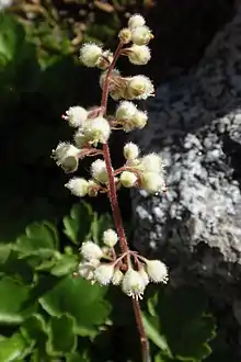 Heuchera merriamii is a species of flowering plant in the saxifrage family known by the common name Merriam's alumroot. It is native to the Klamath Mountains of southern Oregon and northern California, where it grows on the rocky slopes. This is a rhizomatous perennial herb producing a patch of leaves which are rounded and have five to seven lobes along the edges. It produces an erect inflorescence up to about 23 centimeters tall with sparse clusters of pinkish, yellow, or cream flowers. The inflorescence is covered in glandular hairs. Each flower has small spoon-shaped petals and protruding stamens.