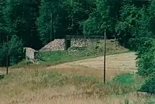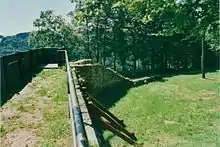 The northeastern flank was guarded by a 2.6-metre-wide, 3.5-metre-high and 110-metre long wall made of sandstone. This was in turn protected by a 3.5-metre-wide berm and a shallow ditch The wall on the inner side of the pincer gateway is only of single-leaf construction. The outer wall either side of the gateway approach on the hillside, was 2 metres wide and continued as a 55-metre-long wooden defensive breastwork. This probably enclosed the entire site. The gateway had a 1-metre-wide portal at the rear with a projecting wooden tower.