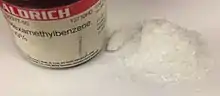 According to the Blue Book, this chemical can be systematically named as 1,2,3,4,5,6-hexamethylbenzene. The locants (the numbers in front of the name) are superfluous, however, as the name hexamethylbenzene uniquely identifies a single substance and thus is the formal IUPAC name for the compound.[30] It is an aromatic compound, with six π electrons (satisfying Hückel's rule) delocalised over a cyclic planar system; each of the six ring carbon atoms is sp2 hybridised and displays trigonal planar geometry, while each methyl carbon is tetrahedral with sp3 hybridisation, consistent with the empirical description of its structure.[1] Solid hexamethylbenzene occurs as colourless to white crystalline orthorhombic prisms or needles[31] with a melting point of 165–166 °C,[5] a boiling point of 268 °C, and a density of 1.0630 g cm−3.[31] It is insoluble in water, but soluble in organic solvents including benzene and ethanol.[31]
