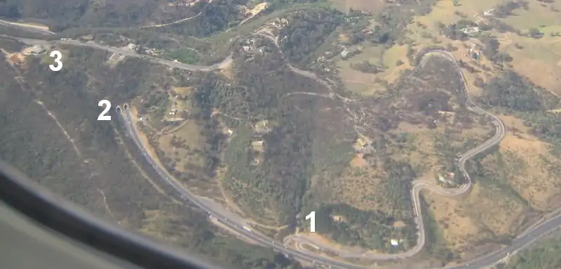The Heysen Tunnels are twin tube road tunnels which carry the South Eastern Freeway under Eagle On The Hill in the Mount Lofty Ranges in South Australia. The tunnels were excavated using a tunnelling machine normally used in heavy-duty mining operations which tunnelled through 500 metres (1,600 ft) of rock for each tunnel at an average rate of 3 metres (9.8 ft) per day.[3] The tunnels were completed in 1998 and opened on 5 March 2000.[4][5] Each tunnel carries three lanes of traffic. As at 2015, 45,700 vehicles passed through them daily.[1] The maximum height of vehicles permitted in the tunnels is 5.3 metres (17 ft), the same as the Crafers and Mt Osmond interchanges. Laser height detectors monitor traffic to provide warnings to drivers before they attempt to enter the tunnel.[2]