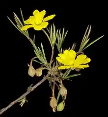Hibbertia acerosa, commonly known as needle leaved guinea flower,[2] is a species of flowering plant in the family Dilleniaceae and is endemic to the south-west of Western Australia. It is a low, spreading or ascending shrub typically growing to a height of 10–60 cm (3.9–23.6 in) and has yellow flowers from July to December or from January to February.