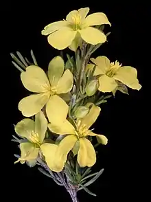 The variety hibbertioides is widespread in the far south-west of Western Australia where it grows in woodland and heath from Mount Lesueur to Dwellingup and inland to near Pingelly.[2][11] Variety meridionalis grows in mallee and heath from near Hopetoun to near Esperance[2][12] and var. pedunculata in woodland from near York to near Arthur River.[2][13]