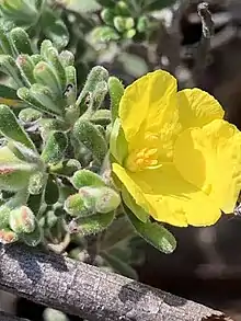 Hibbertia horricomis is an erect to spreading shrub that typically grows to a height of up to 30 cm (12 in) with hairy foliage. The leaves are linear to elliptic, 3–7 mm (0.12–0.28 in) long and about 1 mm (0.039 in) wide with a pimply upper surface. The flowers are arranged singly on the ends of the branchlets and are sessile. The five sepals are joined at the base, the two outer sepal lobes egg-shaped, 6.8–7.3 mm (0.27–0.29 in) long and the inner lobes slightly shorter. The five petals are egg-shaped with the narrower end towards the base, yellow, 7.5–9.5 mm (0.30–0.37 in) long. There are twenty to twenty-four stamens arranged around two hairy carpels, each carpel with four ovules.[2][3]