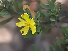 Hibbertia oligodonta is compact, erect shrub that typically grows to a height of up to 1 m (3 ft 3 in) with straggly brances and branchlets that are densely hairy when young. The leaves are egg-shaped or wege-shaped with the narrower end towards the base, 14–28 mm (0.55–1.10 in) long and 6–14 mm (0.24–0.55 in) wide on a petiole 1.5–3 mm (0.059–0.118 in) long. There are usually up to four teeth on each side of the leaves and both surfaces are densely hairy. The flowers are arranged singly in leaf axils on the ends of short side branches and are sessile, the five sepals broadly elliptic and 7–10 mm (0.28–0.39 in) long, the inner sepals larger than the outer ones. The five petals are yellow, egg-shaped to wedge-shaped with the narrower end towards the base, 9–15 mm (0.35–0.59 in) long with 22 to 38 stamens arranged around three glabrous carpels.[2]