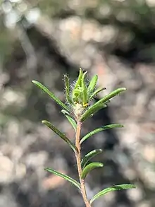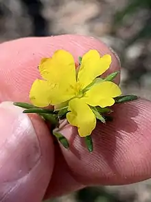 This hibbertia grows on sandstone ridge-tops in woodland and heathland mainly between Baulkham Hills and South Maroota in the northern outskirts of Sydney.[2][3][5]