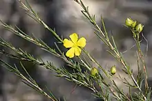 Hibbertia virgata is an erect, rarely low-lying shrub that typically grows to a height of up to 1.5 m (4 ft 11 in), its branches sometimes covered with woolly hairs. The leaves are linear, often cylindrical or grooved, 5–25 mm (0.20–0.98 in) long, 0.5–3.2 mm (0.020–0.126 in) wide and sometimes covered with silky hairs. The flowers are usually arranged on the ends of short side shoots and are sessile with hairy bracts 1.2–3.5 mm (0.047–0.138 in) long at the base. The sepals are oblong to egg-shaped, 5.4–9.8 mm (0.21–0.39 in) long, the petals bright yellow, egg-shaped with the narrower end towards the base, 5.8–12.2 mm (0.23–0.48 in) long. There are ten to twelve stamens arranged around three glabrous carpels. Flowering occurs from August to December.[2][3][4][5]