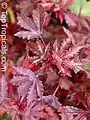The foliage of cranberry hibiscus is similar to that of the Japanese maple. It has dicot leaves which vary in shape from 3-5-lobed to un-lobed or undivided in the upper leaves of the plant and are generally the size of a small child's hand, about 10×10 cm.[2][5] They tend to be alternate, simple, and deeply cut with crenate or jagged edges.[1] Leaf color is observed as a dark maroon to a patchy red/green appearance. Stipules are linear, measured approximately 1.5 cm in length.[2] Both stems and petioles (3–11 cm in length) are smooth or generally free from hair.[2] Acetosella is further divided into a section called Furcaria, which is a group of approximately 100 species that have non-fleshy calyx or sepals.[2] The sepals contain 10 veins, 5 of which run to the apices of the segments; the other 5 run to the sinuses.[2] Stems tend to be variegated.[4] Flowers are solitary and sit atop a 1 cm long pedicel. They vary in color and are most often the dark maroon that is characteristic of the foliage with darker vein-like markings. Flowers are rarely yellow in color and are about 5 cm {2 inches} deep. Each flower contains numerous stamens at about 2 cm in length.[2] The cranberry hibiscus is bisexual and is thought to be self-pollinating. It produces seeds that are reniform and dark brown with dimensions of 3×2.5 mm.[2]
