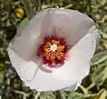 The flower is a pale white, hence the name paleface, or pale light lavender to light pink. The petals can be rice paper thin, and on some plants nearly translucent; the flower petals are broad and roundish, also overlapping; the entire flower is a broad cup shape. One vertical branch will often have a terminal flower, and axial flowers along the branch. The flowers will bloom depending on seasonal temperatures starting in January to the end of late summer/fall in October.