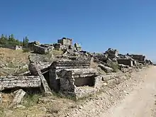 Beyond the city walls and meadow, following the main colonnaded road and passing the outer baths (thermae extra muros), an extensive necropolis extends for over 2 kilometres (1.2 mi) on both sides of the old road to Phrygian Tripolis and Sardis. The other goes south from Laodikya to Closae. The necropolis extends from the northern to the eastern and southern sections of the old city. Most of the tombs have been excavated.
