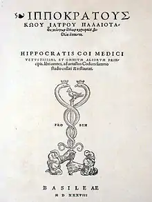 Title page from a 1538 edition of Hippocrates with the Froben publishing house logo