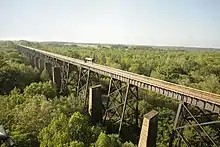 High Bridge is a historic former railroad bridge across the Appomattox River valley about 6 miles (9.7 km) east, or downstream, of the town of Farmville in Prince Edward County, Virginia. The remains of the bridge and its adjacent rail line are now a rail trail park, High Bridge Trail State Park.