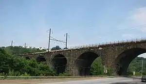 While the PRR had been using steel bridges since the 1880s,[5] and was constructing others nearby at the time, such as the High Bridge at Downingtown,[6] President A. J. Cassatt decided in favor of a stone bridge at this location and elsewhere. This reflected the influence of PRR Chief Engineer William H. Brown,[5] who rebuilt many of the railroad's bridges in masonry during his tenure.[7] While more expensive than steel, Brown felt that stone bridges were stronger and more durable,[8] and less expensive to maintain in the long term.[5]