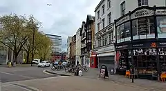 After the war, Bristol's shopping centre was moved to Broadmead.[11] In 1963 the few remaining buildings on the east side of High Street were demolished, the street was widened,[12] and its junction with Wine Street was turned into a short dual carriageway which diverted traffic away from the original crossroads with Corn Street and Broad Street.[13][14]