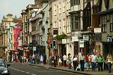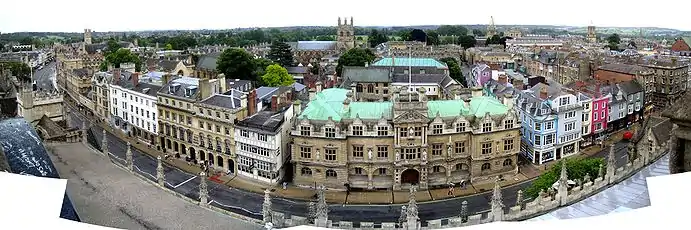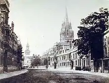 The street has been described by Nikolaus Pevsner as "one of the world's great streets".[2] It forms a gentle curve and is the subject of many prints, paintings, photographs, etc. The looking west towards Carfax with University College on the left and The Queen's College on the right is an especially popular view. There are many historical buildings on the street, including the University of Oxford buildings and colleges.[3] Locally the street is often known as "The High".