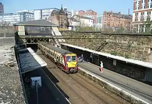 ![]() Train arriving at Glasgow High Street. The campus buildings of Strathclyde University are visible at the top of the photograph. | |
