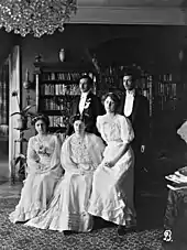 High society, also called in some contexts simply "society", is the behavior and lifestyle of people with the highest levels of wealth and social status. It includes their related affiliations, social events and practices.[1][2] Upscale social clubs were open to men based on assessments of their ranking and role within high society.[3] In American high society, the Social Register was traditionally a key resource for identifying qualified members. For a global perspective, see upper class. The quality of housing, clothing, servants and dining were visible marks of membership.[4]