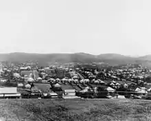 Among the first European residents was George Wilson and his wife and family of 8 who built a homestead in Bellevue Street in the 1860s. He is thought to have named the locality Highgate Hill (possibly after Highgate Hill in London),[3] however the name first appears in an advertisement for a land sale in 1864 by Nehemiah Bartley of the "Highgate Hill Estate" located at the peak of the hill.[9][10] [11]The large portions of land from early land sales were slowly subdivided into residential blocks, and advertisements mentioned the notable residents of the area to emphasise its attractiveness.[12] However the lack of water proved to be an obstacle to significant take up. Water had to be collected in rain water tanks when possible or fetched from springs in the West End area. This problem was solved by the completion in 1889 of the Highgate Hill Service Reservoir near the corner of Dornoch Terrace and Gladstone Road. The reservoir is still in use today[8][13]