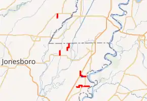 The route runs north through Leachville to an intersection with Highway 77. The two highways form a concurrency heading east to Poplar Corner. The concurrency ends when Highway 77 turns south; Highway 119 heads north for about 2 miles (3.2 km) before turning east. After one mile (1.6 km), it is in the community of Buckeye and makes a left turn towards the Missouri state line. It travels north for about 2.6 miles (4.2 km) before entering the community of Box Elder and ending at the state line.[2] Missouri Supplemental Routes K and Y continue north from the state line and travel to Hornersville, Missouri.[2]
