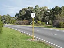 The Western Australian section of Highway 1 starts at the South Australian border, east of Eucla. It follows the Eyre Highway west to Norseman, designated National Highway 1. At Norseman, Highway 1 continues south along Coolgardie-Esperance Highway as National Route 1, while the National Highway follows Coolgardie-Esperance Highway north, as National Highway 94. After reaching Esperance, Highway 1 follows South Coast Highway to Ravensthorpe and Albany, and then follows the coast to Walpole. The highway departs Walpole as South Western Highway, travelling north-west to Bunbury via Manjimup, Bridgetown, and Donnybrook. The highway follows Robertson Drive, Bunbury's ring road, and then heads north via Forrest Highway. At Lake Clifton, Old Coast Road takes Highway 1 north along the coastline to Halls Head, south of Mandurah. From Halls Head, the highway bypasses Mandurah via Mandurah Road, and continues north along that road to Karnup, at the edge of the Perth Metropolitan Region.[1]