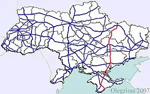 Highway M18 is a Ukrainian international highway (M-highway) connecting Kharkiv to the southern coast of Crimea in Yalta.[1] The highway is also has an alternative route (M29) which runs parallel and designed as an expressway between Kharkiv and Novomoskovsk. The section from Novomoskovsk to Yalta is part of European route E105.[2] The section from Kharkiv to Krasnohrad was previously P51.