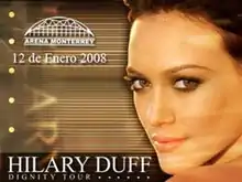 The Dignity Tour is the fourth concert tour by Hilary Duff in support of her fourth album Dignity. Tickets for most of the leg sold out prior to the show. The tour began in Los Angeles, California on July 28, 2007, and closed in Melbourne, Australia at Rod Laver Arena on February 3, 2008.