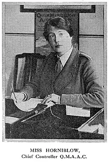 In the 1918 New Year Honours, Horniblow was appointed Officer of the Order of the British Empire (OBE).[4] She was promoted to Commander of the Order of the British Empire (CBE) in the 1919 Birthday Honours "for valuable services rendered in connection with the War".[1][5]