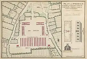 A plan for barracks on the site was first drawn up by William Dundas in 1756, in connection with the construction of Hilsea Lines (designed to protect Portsmouth and its Dockyard from landward attack). Building commenced in 1780; as designed, the barracks consisted of rows of long wooden huts arranged around three sides of a parade ground.[4] In 1794 the barracks were extended, so as to accommodate several thousand troops.[5] Following the Napoleonic Wars these barracks were gradually dismantled, the last part being taken down (and the materials sold) in February 1822.[6] Only the associated hospital was retained.[7]