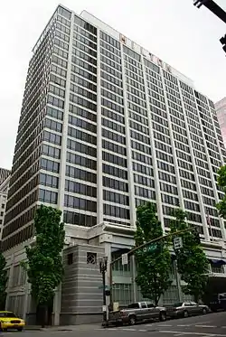 Contractors Andersen–Westfall built the original tower.[5] A region-wide strike by the Carpenters Union paused the project in April 1962 when union workers went on strike and picketed the construction site.[6] When the top full floor was finished in August 1962, the building became the tallest in Portland, overtaking the Public Service Building.[7] At that point the structure stood at 229 feet (70 m) tall and was scheduled to top out at 249 feet (76 m) when the penthouse was added.[7] The $12.5 million hotel was dedicated in May 1963 with a ceremony featuring Conrad Hilton, U.S. Senator Mark O. Hatfield, and Mayor Terry Schrunk.[8] At opening, it had 500 rooms, 5 restaurants and bars, 9 meeting rooms, and was designed as a convention center.[8] The Executive Tower, at 545 S.W. Taylor Street, stands kitty-corner from the original structure and was completed in 2002.