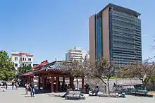 After the groundbreaking ceremony was held for a new Hall of Justice in 1958,[19] redevelopment planning began for the site. The San Francisco Planning Commission authorized the sale of the old Hall of Justice site in December 1960 and set an August 1961 move-out date for the final agencies occupying it.[20] The San Francisco Greater Chinatown Community Service Association Organization (SFGCCSA) was formed in February 1963 to lobby the San Francisco Board of Supervisors (SFBOS), proposing to convert the old Hall of Justice into a publicly-accessible facility to serve the Chinatown community;[21] at the time, San Francisco Mayor George Christopher was advocating for the sale of the property, which would help finance the construction of a new Central Police Station.[22] The city announced the land would be placed on sale one month later in March, with a minimum bid of $850,000.[23]: 7 Upon learning that Howard Johnson was planning on acquiring the land for a 21-storey motel, Choy, representing SFGCCSA, convinced the SFBOS to postpone the sale decision, giving them time to draw up a plans for converting the old Hall of Justice into a Chinese cultural and trade center. SFGCCSA hired J. Francis Ward and Associates in April 1964; that firm had previously designed the Ping Yuen public housing project in Chinatown, and assigned the redesign work to Thomas Hsieh.[23]: 7