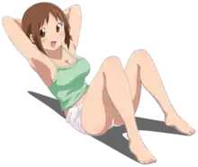 In Japanese, the character is voiced by Mai Kadowaki.[1] All three OVAs were produced at Studio Hibari, with character designs from Ryoko Amisaki and the screenplay written by Muneshige Nakagawa.[2] In the first OVA, Training with Hinako, Hinako is transformed into an anime figure through a television and then talks to the viewer. After that, she begins to exercise to lose some weight, providing the viewer with fan service in the process.[3] The video is in an interactive format, allowing the viewer to rearrange the scenes in the video.[4] The intention behind the production of the first DVD was to make an animation that could be participated in.[5] This DVD became a bestseller on Amazon in Japan in April 2009.[6] The second OVA, Issho ni Sleeping: Sleeping with Hinako, shows Hinako going to bed and sleeping, while again addressing the viewer directly at the beginning. This second OVA has been panned for sometimes distracting from its main premise of showing the character sleep.[7] Home video releases of the OVAs include releases in Japan,[8][9][10] the USA,[11] Germany,[12][13][14] France[15][16] and Italy.[17][18] Android Apps have been released for Training with Hinako in 2010[19] and Sleeping with Hinako in 2011.[20] A pirated version of the Training with Hinako app contained a smartphone virus, the first such virus found in Japan.[21] Hinako's effect on the viewer has been described as legitimizing their existence in the fictional setting by recognizing the existence of the viewer and thereby letting them identify with the character.[22] Merchandise released for the character includes an anime figure by Good Smile Company,[23] a bathing mitten[24] as well as an artbook[25] and a guidebook for Android mobile devices.[26]