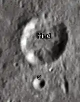 Hind is a lunar impact crater that lies to the southeast of the walled plain Hipparchus, and due east of the crater Halley. Its diameter is 29 km. It was named after British astronomer John Russell Hind.[1] The rim of Hind is relatively free of wear and distortion, except for a break at the north rim. The floor of Hind is relatively uneven, however, compared to the interior of Halley. Hind and the craters Hipparchus C and Hipparchus L form a line with diminishing diameters that point to the northeast.