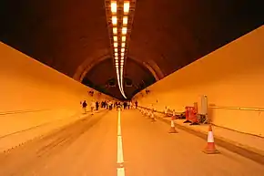 Fatal fires in the Mont Blanc Tunnel and the Gotthard Road Tunnel in 1999 and 2001 respectively, resulting in the temporary closures of these tunnels, led to a re-evaluation of road tunnel safety throughout Europe.[24][25] An EU directive[26] passed in 2004 laid down the minimum safety requirements for road tunnels within the EU and EFTA that exceed 500 m in length and that are part of the Trans-European Road Network (TEN). Although the Hindhead tunnel is more than 500 m in length, it does not carry part of the TEN road network so legally does not need to comply with the directive.[27]