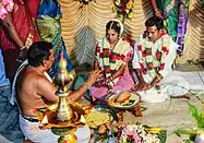 Priests' primary responsibility is to conduct daily prayers (puja) at the local mandir. During Hindu festivals, traditional events such as weddings, the sacred thread ceremony, performance of antyesti, and special deity-specific ceremonies, priests may be called upon to conduct pujas. In order to perform a puja, the priests are required to have prior skills and knowledge. To be a qualified priest, they must know the required chants (mantras and strotas) fluently in Sanskrit and be familiar with the materials required to perform the puja for various ceremonies and rituals.[1] Pandits from an early age were trained to memorize hymns in order to chant them during rituals and ceremonies without aid. Receiving assistance to remember hymns and chants was historically frowned upon as priests were expected to recite the hymns through memory.[3]