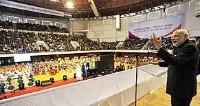 An Art Of Living (AOL) class was first held in Ulaanbaatar in 1995.[42] The Meditation centre in Mongolia is currently training over one hundred teachers how to conduct courses conceptualised by Sri Sri Ravi Shankar, and over one million Mongols have attended at least one Art Of living course or retreat.[43] A Mongolian interviewee of writer Narayani Ganesh who attends the Art Of Living courses affirmed that he did not give up Buddhism to adopt Sri Sri Ravi Shankar's philosophies; that instead, the two systems complement each other.[44] According to Saskia Abrahms-Kavunenko, one in three Lay Buddhists have attended at least one of Art Of Living retreats.[5] Sri Sri Ravi Shankar has visited Mongolia three times, each time he has been greeted with an audience of between Three thousand and Five thousand people.[45] An international Art Of Living Ashram is being built on a site near Ulaanbataar.[46] According to Narayani Ganesh, the Art of Living spiritual organisation has been successful in former soviet countries such as Russia, Poland and Mongolia that lack spiritual guidance due to the years of religious repression.[47]