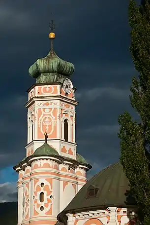 On the far side of the Inn Valley, the plans for the little church dedicated to St Anna in Baumkirchen were probably also drawn up by Guarinonius.[14]