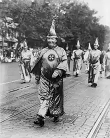 In response to the decline in Klan membership, Evans organized a Klan parade in 1926 in Washington, D.C., hoping that a large turnout would demonstrate the Klan's power. About 30,000 members attended, making it the largest parade in the group's history. Evans was disappointed, however, as he had expected twice as many people, and the march did not stanch the drop in membership.[94] That year, Evans attempted to rally U.S. senators to vote against a bill supporting a proposed world court. He was unsuccessful, however, and several Klan-backed senators followed Coolidge and supported the bill.[97] In 1928, Evans opposed the candidacy of the New York Democratic governor Al Smith for president and emphasized the threat of Smith's Catholic faith. After the Republican Herbert Hoover won the election, Evans boldly claimed responsibility for Smith's loss, but most of the solidly-Democratic South had rejected Hoover and voted for Smith against the Klan's advice.[98]