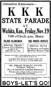 In 1921, Evans was assigned to oversee the Klan's national membership drive at the behest of their publicists, Elizabeth Tyler and Edward Young Clarke.[7][13] In 1922, the group's leadership made Evans the "Imperial kligrapp", a role similar to national secretary, in which capacity he oversaw operations in 13 states.[5][13] He received a base salary of $7,500 and traveled throughout the country, regularly meeting with local Klan leaders.[13]