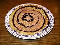 The first appearance of the word "okonomiyaki" was at a shop in Osaka in the 1930s.[2][7][8] After the 1923 Great Kantō earthquake when people lacked amenities, it became a pastime to cook these crêpes,[1] and after World War II (when there was a short supply of rice)[6] okonomiyaki emerged as an inexpensive and filling dish for all ages, often with savory toppings, such as meat, seafood, and vegetables.[1][5][9] This "okonomiyaki boom" saw household equipment and ingredients for the dish become commercially available.[5] Monjiyaki also developed into the related modern dish monjayaki (モンジャ焼き), which has a more runny batter due to more added water, resulting in a different cooked consistency.[5]
