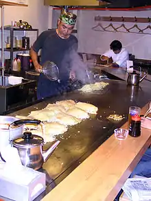 It is sometimes compared to an omelette or a pancake and is sometimes referred to as a "Japanese pizza" or "Osaka soul food".[14][9][15][16] The dish can be prepared in advance, allowing customers to use a teppan or special hotplates to fry after mixing the ingredients. They may also have a diner-style counter where the cook prepares the dish in front of the customers.[17]