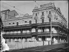 A call for tenders to construct the complex was put out, and the winning tender was by Friederich Wilhelm Gustav Liebe, an immigrant from Saxony who had previously constructed the Bulgarian Houses of Parliament in Sofia and worked on the Budapest Opera House.[8] The tender price was £46,000,[5] of which £43,000 was the cost of the building alone.[2] The construction contract between Molloy and Liebe was signed in November 1902,[7] and Heinrich Schmidt was appointed as foreman for Liebe.[9] Deep excavation of the site for the building's foundations and basement started almost immediately.[5][10]