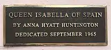 Sculptor Anna Hyatt Huntington created and donated a bronze sculpture of Queen Isabella riding a donkey that was placed in the center of the garden on a raised pedestal.[7] A square pool was placed underneath the statue, and is surrounded by an inlaid pebble mosaic that was inspired by Spanish design.[6]