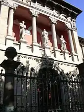 The land used for the Exposition was the so-called Huerta de Santa Engracia, surrounding the current Plaza de los Sitios. 36,500 workers were hired to work on the projects of Ricardo Magdalena and other architects. Magdalena designed the most important buildings; among those that he was responsible for were the present-day Museo Provincial de Zaragoza, an enormous Neo-Renaissance palace inspired by the Aragonese palaces of the 16th century, and the Gran Casino, a modernist building that existed until 1930. The younger architects were in charge of the other buildings. Félix Navarro was responsible for the Escuela de Artes y Oficios which is still standing, in the Plaza de los Sitios. In the center of the Plaza was erected the Monumento a los Sitios by Agustí Querol Subirats, a Catalan sculptor who executed it in a modernist style; it still can be seen today.