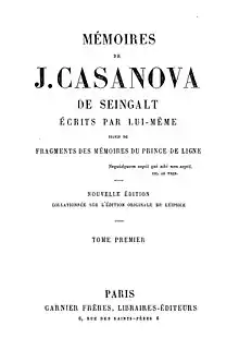 - Jacques Casanova de Seingalt, Histoire de ma vie: Texte intégral du manuscrit original, suivi de textes inédits, Édition présentée et établie par Francis Lacassin, Paris: Éditions Robert Laffont, 3 vol., 1993 Reedition of the Brockhaus-Plon edition. This edition has become the de facto reference edition.[8]