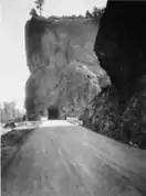 Beyond Multnomah County, State Highway Department engineer John Arthur Elliott surveyed a route along the river through Hood River County in 1913 and 1914, mostly using the 1870s wagon road where available. County voters approved a bond issue in mid-1914 to pay for construction west of the city of Hood River, helped by highway promoter Simon Benson's purchase of the entire issue and promise to pay any overruns. The most difficult location was at Mitchell Point, where the old road included grades of up to 23% to take it over a saddle, and the railroad occupied the only available land between the cliff and the river. Elliott solved the problem by building the Mitchell Point Tunnel—a windowed tunnel like on Switzerland's Axenstrasse—through the cliff, with a viaduct on the west approach. Construction began in March 1915, and the Mitchell Point section was opened to traffic in early September, at a cost of about $47,000. To dedicate the completed highway between Portland and Hood River, two ceremonies were held at Multnomah Falls and Crown Point on the same day in June 1916.[17][18]